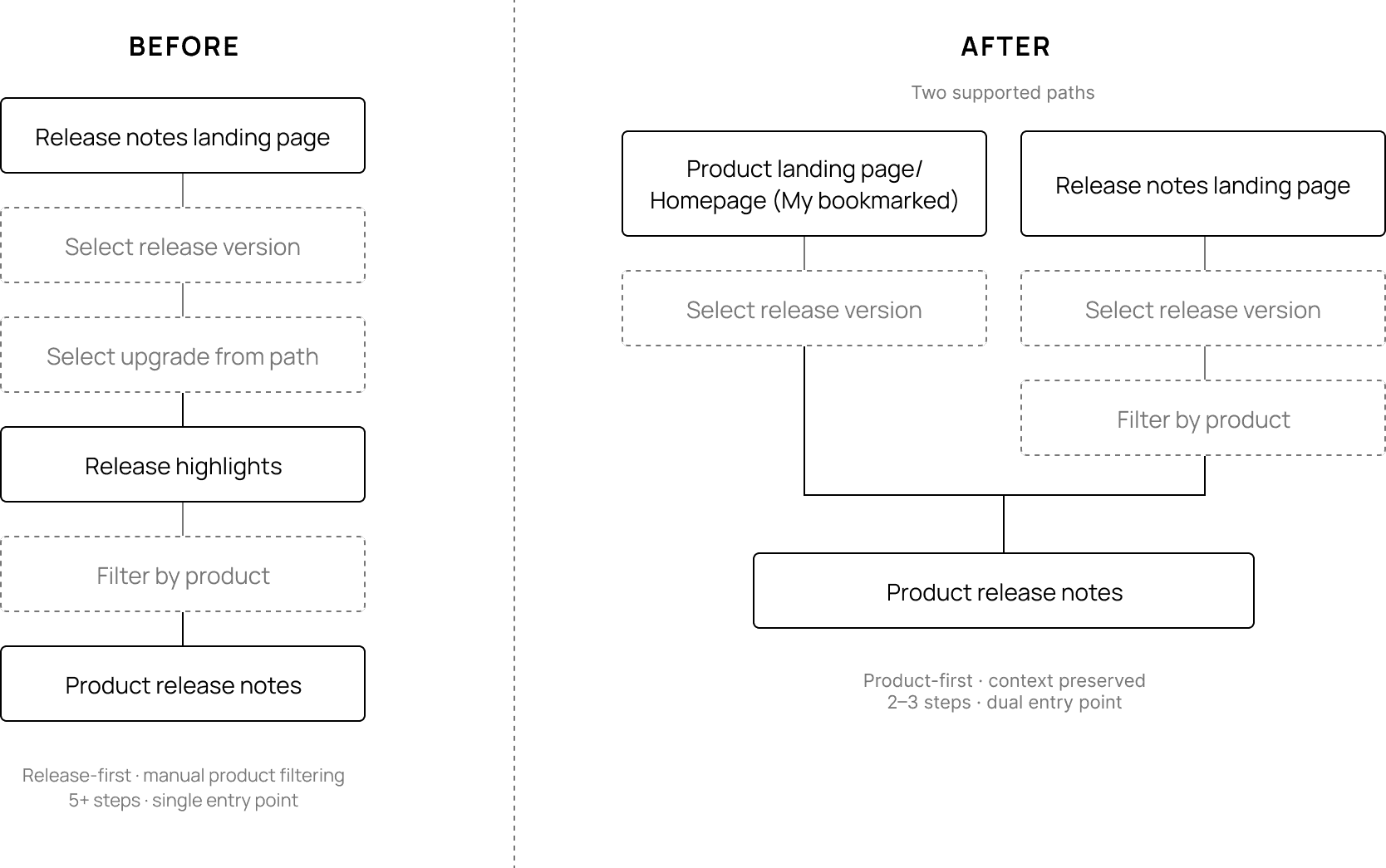 Before: Users needed 4+ clicks to find release notes by product, with navigation that did not match their mental model.